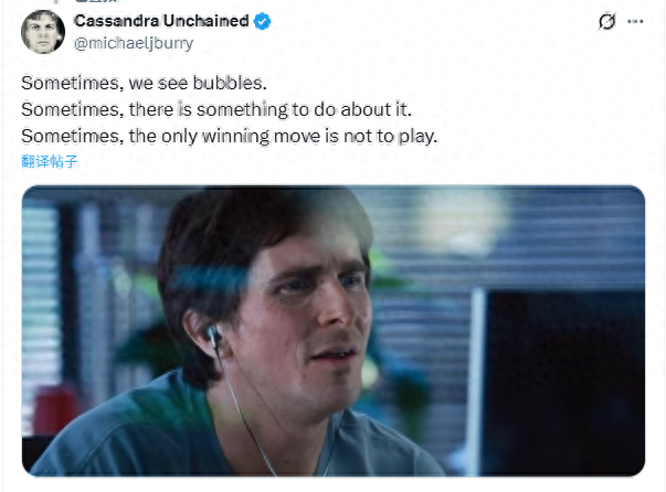 伯里在社交媒体X上分享了一张电影《大空头》的剧照,片中饰演他的演员克里斯蒂安·贝尔正神情错愕地盯着电脑屏幕。他在配文中写道:“有时,我们能看到泡沫。有时,我们能有所作为。有时,唯一的胜利方法就是不参与。”