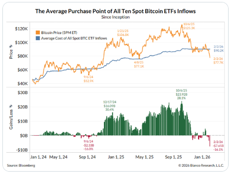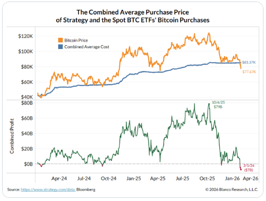 MicroStrategy与11只现货ETF合计持有10%流通量、平均成本高达85360美元,目前整体浮亏约70亿美元。MicroStrategy平均成本约为76000美元,安全垫收窄至不足3%,却仍将优先股股息提至11.25%以吸引资金继续购币。Jim Bianco警告称,“老钱进场”叙事已失效,在缺乏新买盘的情况下,高位被套的机构持仓可能转化为持续抛压。