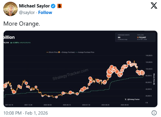 尽管市场情绪低迷,MicroStrategy执行主席Michael Saylor周日仍通过社交媒体平台X发布带有“More Orange”字样的图片,暗示将继续增持。该公司宣布将其A系列永久延期优先股(STRC)的股息提高25个基点至11.25%,意在以高昂的融资成本吸引资本以维持其比特币购买策略。然而,分析指出,若币价持续停滞或跌破其成本线,高额的股息支出可能引发严重的现金流挤压。